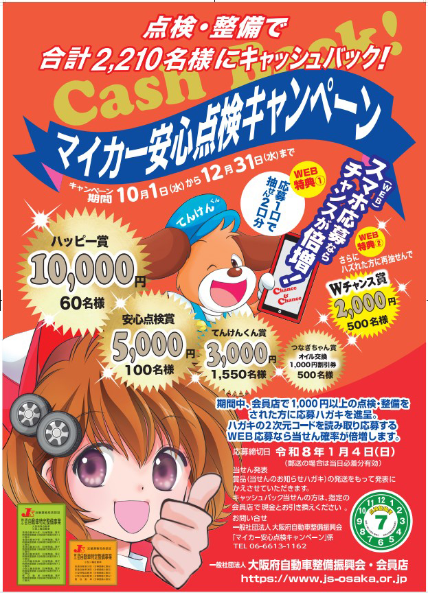 のぼり旗・ポスターを掲示している大阪府自動車整備振興会会員の認証工場では、期間中、車検・点検整備、オイル交換など1,000円以上のお取引をされた方にキャンペーンに参加できる応募ハガキを進呈。抽選で1万円60名様、5千円100名様、3千円1,550名様、さらにWEB応募限定の「Wチャンス賞」2千円500名様を加え、合計2,210名様にキャッシュバック!
