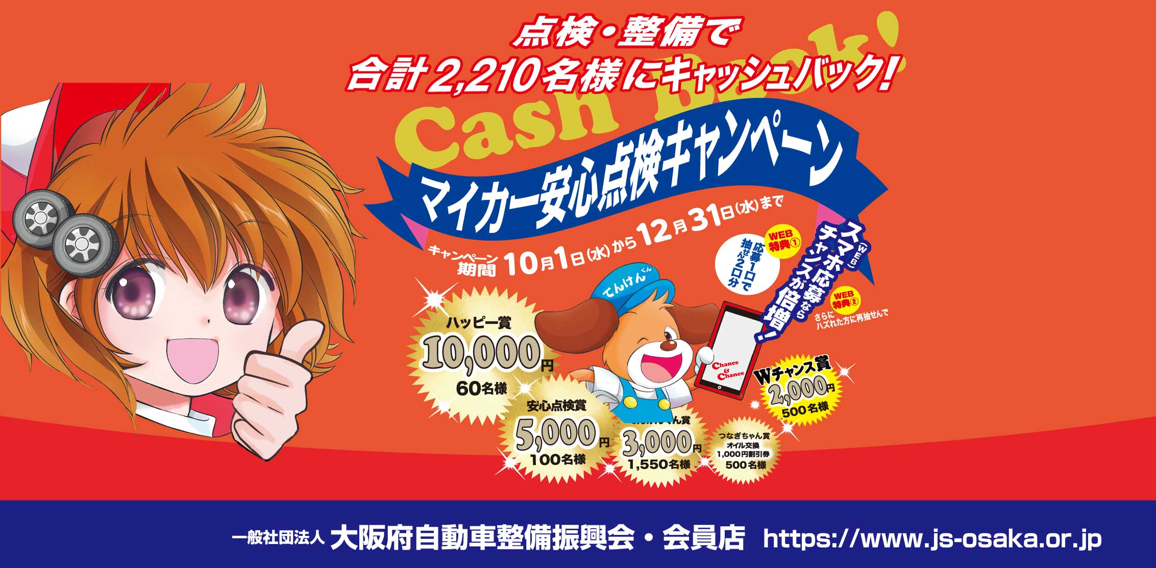 のぼり旗・ポスターを掲示している大阪府自動車整備振興会会員の認証工場では、期間中、車検・点検整備、オイル交換など1,000円以上のお取引をされた方にキャンペーンに参加できる応募ハガキを進呈。抽選で1万円60名様、5千円100名様、3千円1,550名様、さらにWEB応募限定の「Wチャンス賞」2千円500名様を加え、合計2,210名様にキャッシュバック!